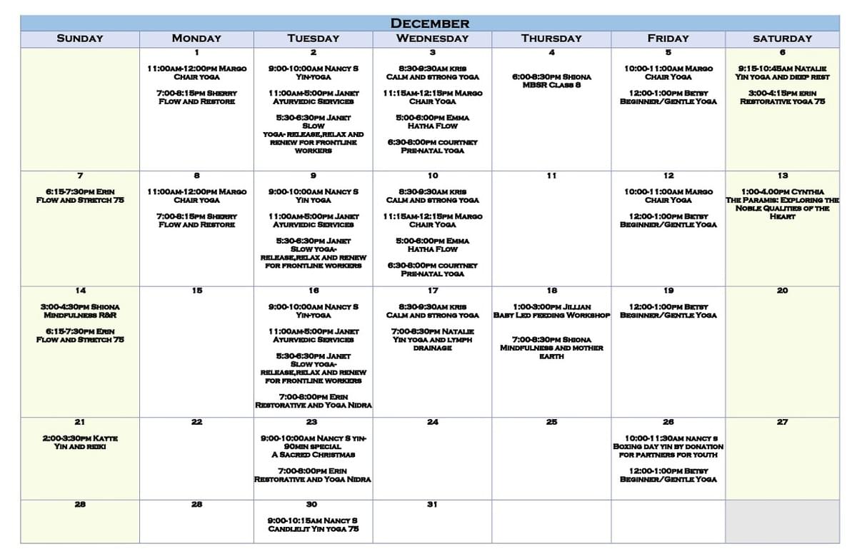 The studio is only open for scheduled classes, sessions, and workshops. Please contact individual teachers to inquire about their classes and to pre-register (see Schedule). If you have a general inquiry, please email Shiona McIntosh (BWC Owner): brooksidewellnesscentre@gmail.com